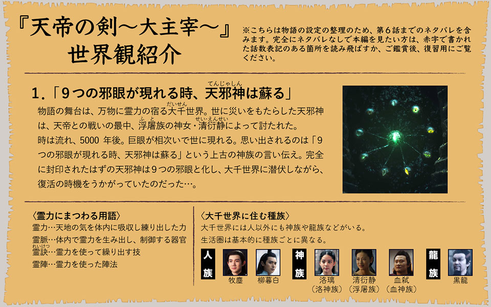 世に災いをもたらした天邪神は討たれた。しかし、完全に滅んだかに思われた天邪神は9つの邪眼と化し、大千(だいせん)世界に潜伏して復活の時機をうかがっていたのだった。5000年という気の遠くなるような時を経て、9つの邪眼は相次いで世に現れる。それは、いまだかつてない災厄が訪れる前ぶれであった…。本作は、日本でも多くのファンを生んだ『神龍〈シェンロン〉』『蒼穹の剣』の原作者である天蚕土豆のweb小説「大主宰(原題)」を映像化したもの。撮影に際して、ニュージーランドで一大ロケを敢行したことも大きな話題となった。そして、撮影監督にはベルリン国際映画祭をはじめ、世界各国の映画祭で絶賛された『象は静かに座っている』のファン・チャオ、美術監督には第44回 台湾金馬奨最優秀美術デザイン賞ノミネート作『ラスト、コーション』のラウ・サイワンが参加。VFXを『戦狼 ウルフ・オブ・ウォー』『ライズ・オブ・シードラゴン 謎の鉄の爪』など多数の大作映画に携わったラボが手掛けるなど、一般的なドラマ作品よりワンランク上の映像作りに挑んでいる。